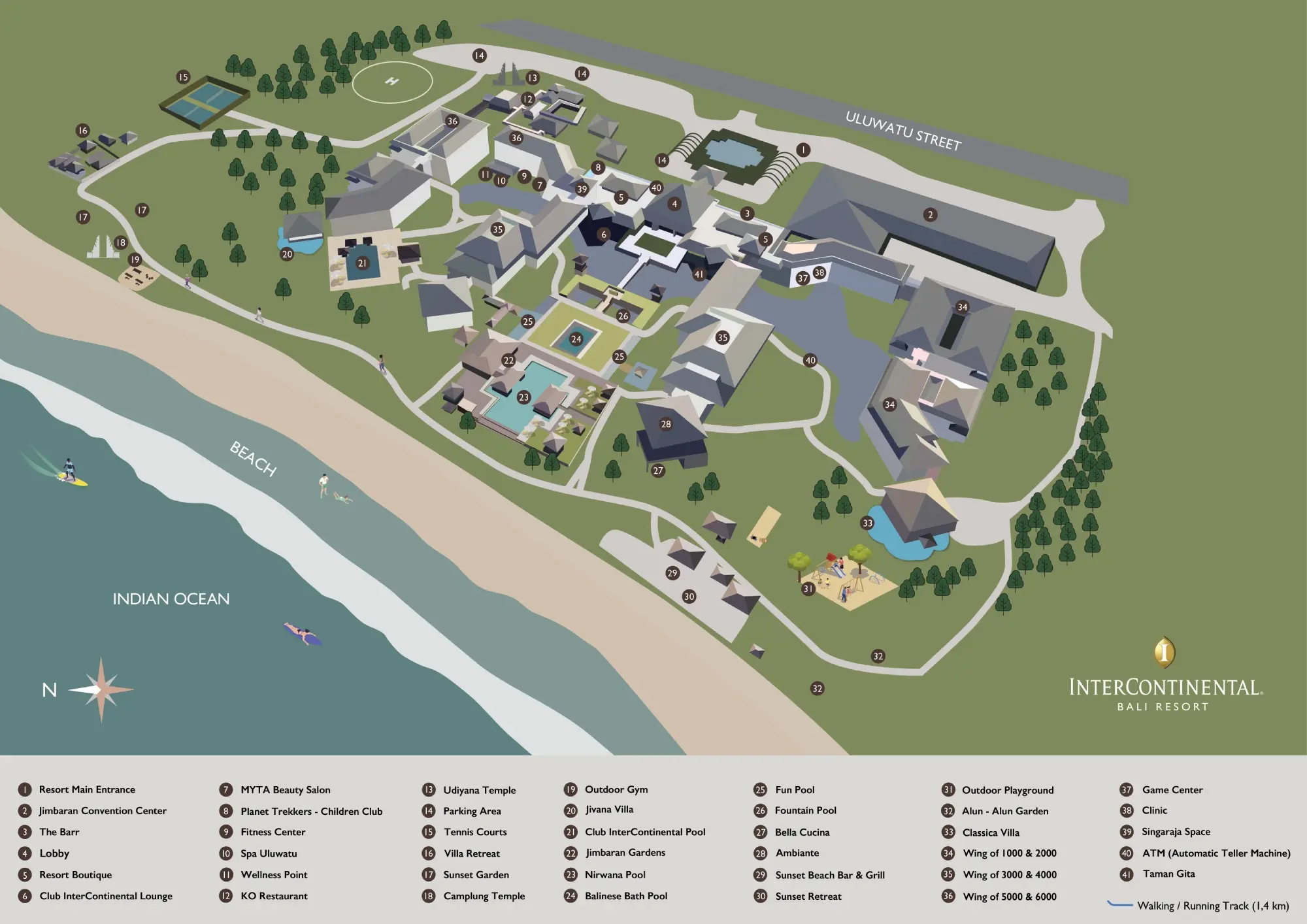 Из курортного отеля Интерконтиненталь Бали открывается захватывающий вид на спокойные лазурные воды залива Джимбаран и его разноцветные закаты. Вечером вы можете стать свидетелем того, как пляж оживает благодаря ресторанам под открытым небом, где подают свежайшие местные морепродукты. Курорт обеспечивает легкий доступ к различным направлениям, включая центральное нагорье Убуда, южные пляжи для серфинга Букит, Куту и Семиньяк. Международный аэропорт Нгурах-Рай находится всего в 15 минутах езды. Вы можете найти карту, на которой подробно описан ландшафт на берегу океана, а также другие наши эксклюзивные удобства.